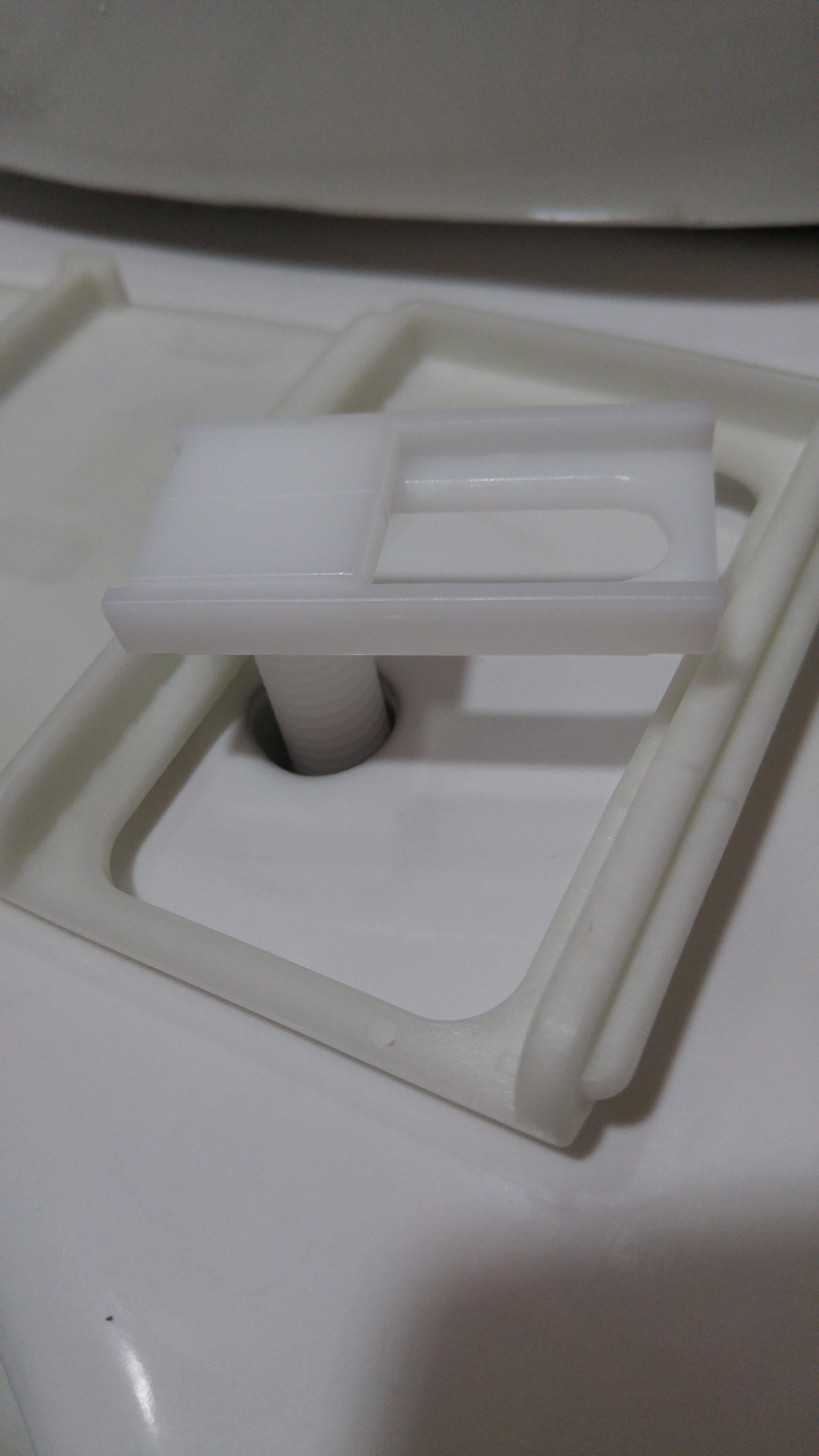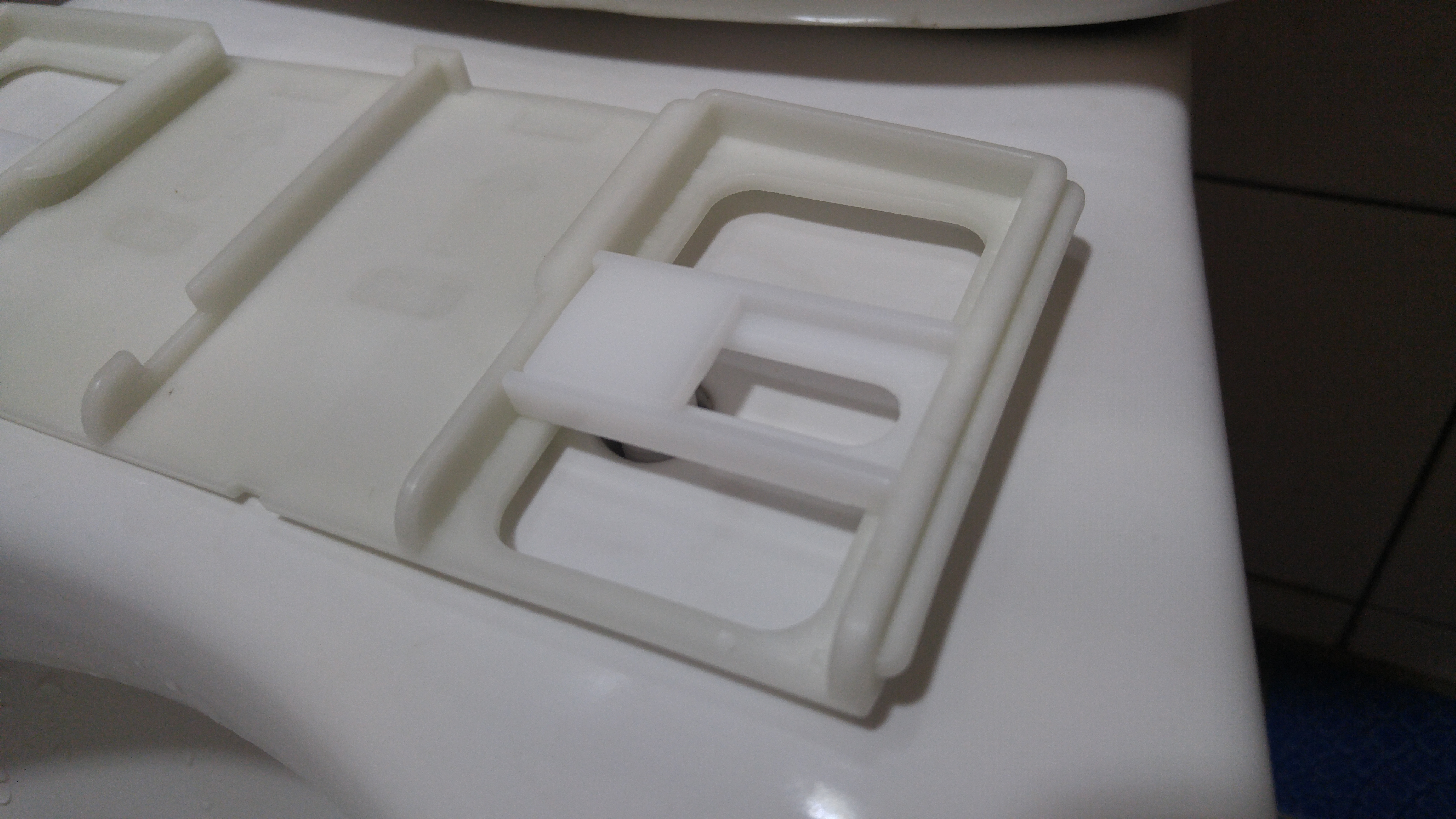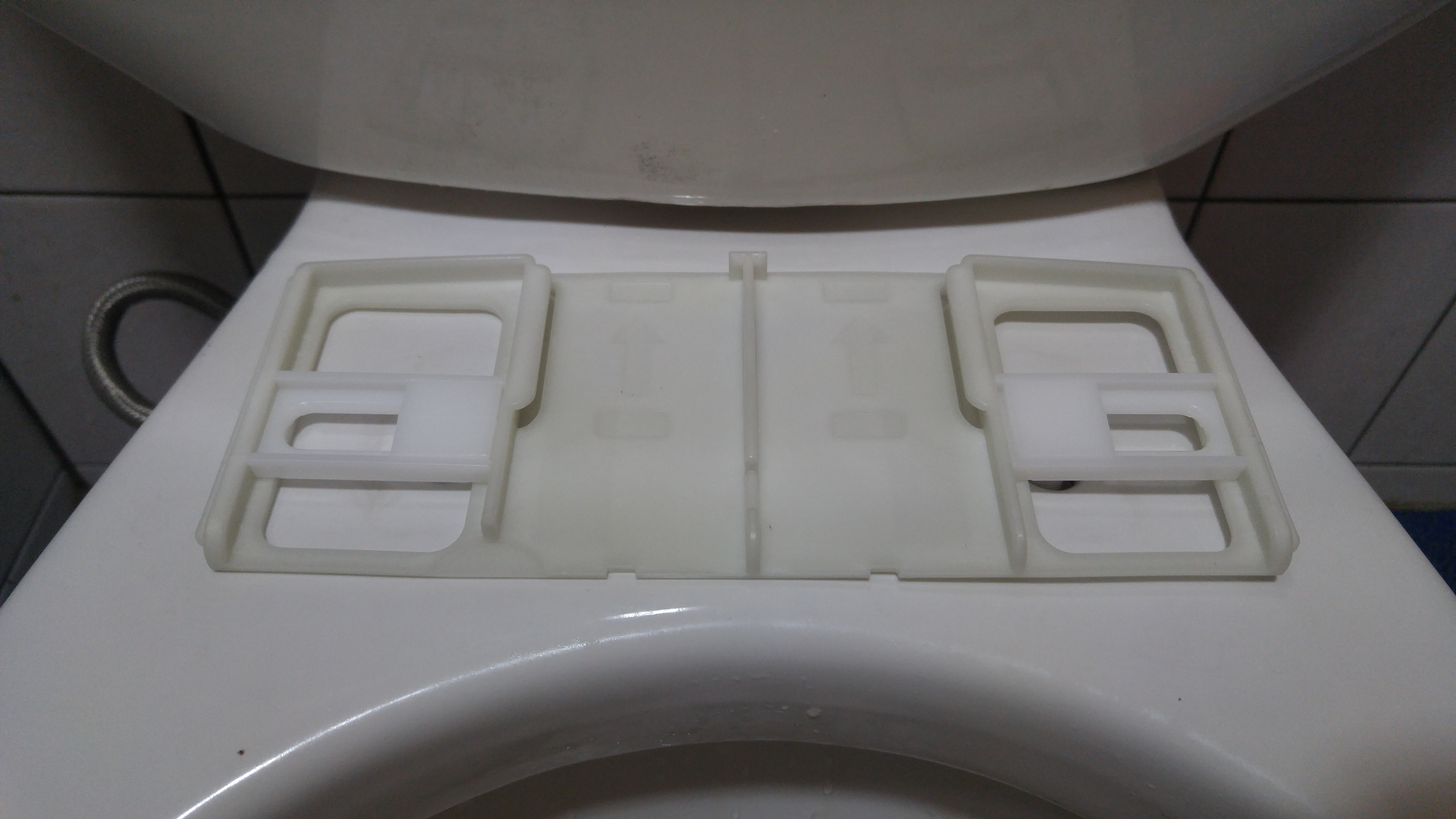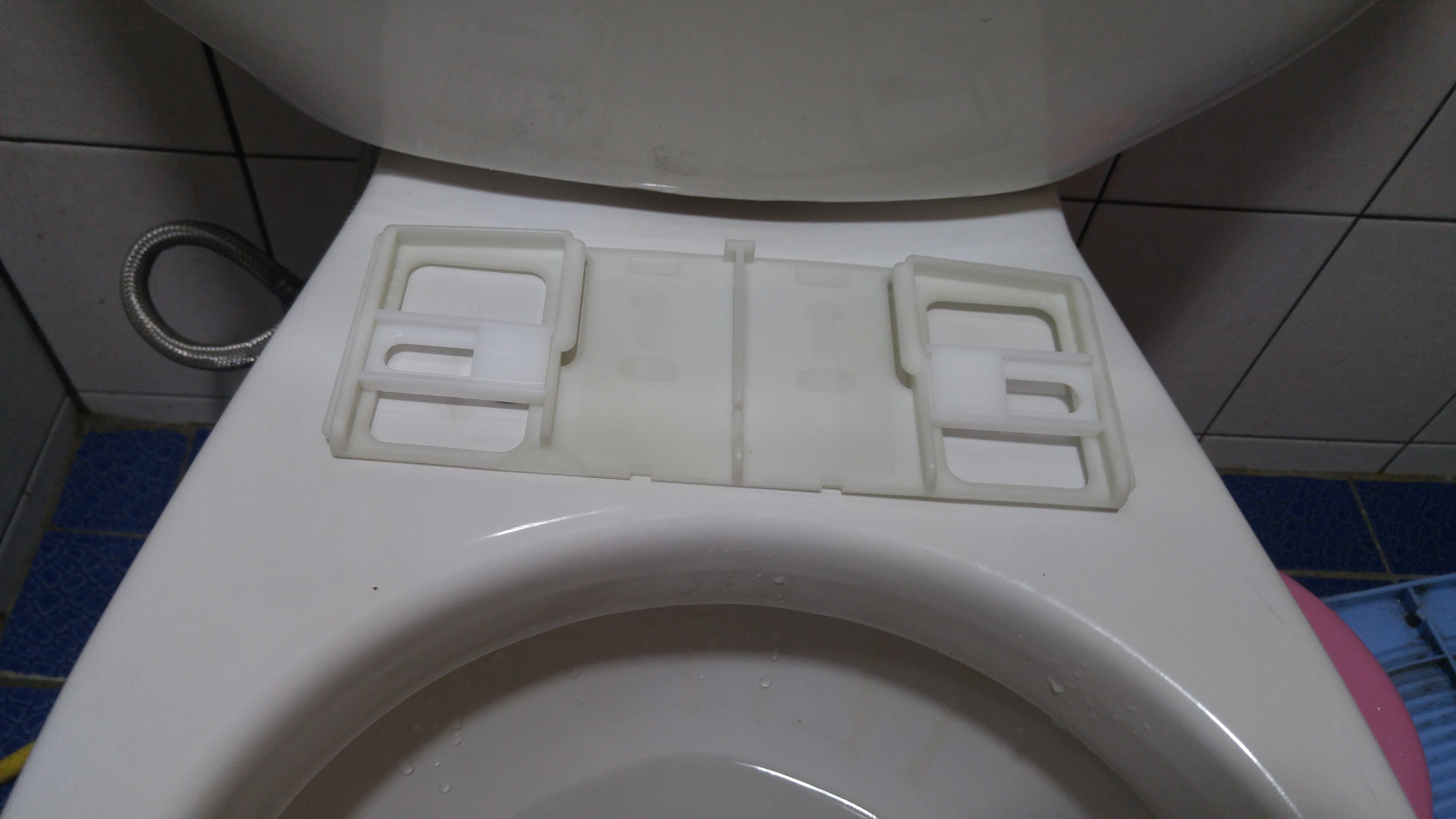 - 위 부품을 변기에 조립하면 아래와 같이 된다. 대부분의 변기는 규격마다 구멍의 위치가 다르긴 하지만 다 뚫려 있다. 그래서 그 위치에 맞출 수 있도록 조정 가능하게 나온다. 즉 대부분의 변기 크기에 맞도록 제작되어 있다.