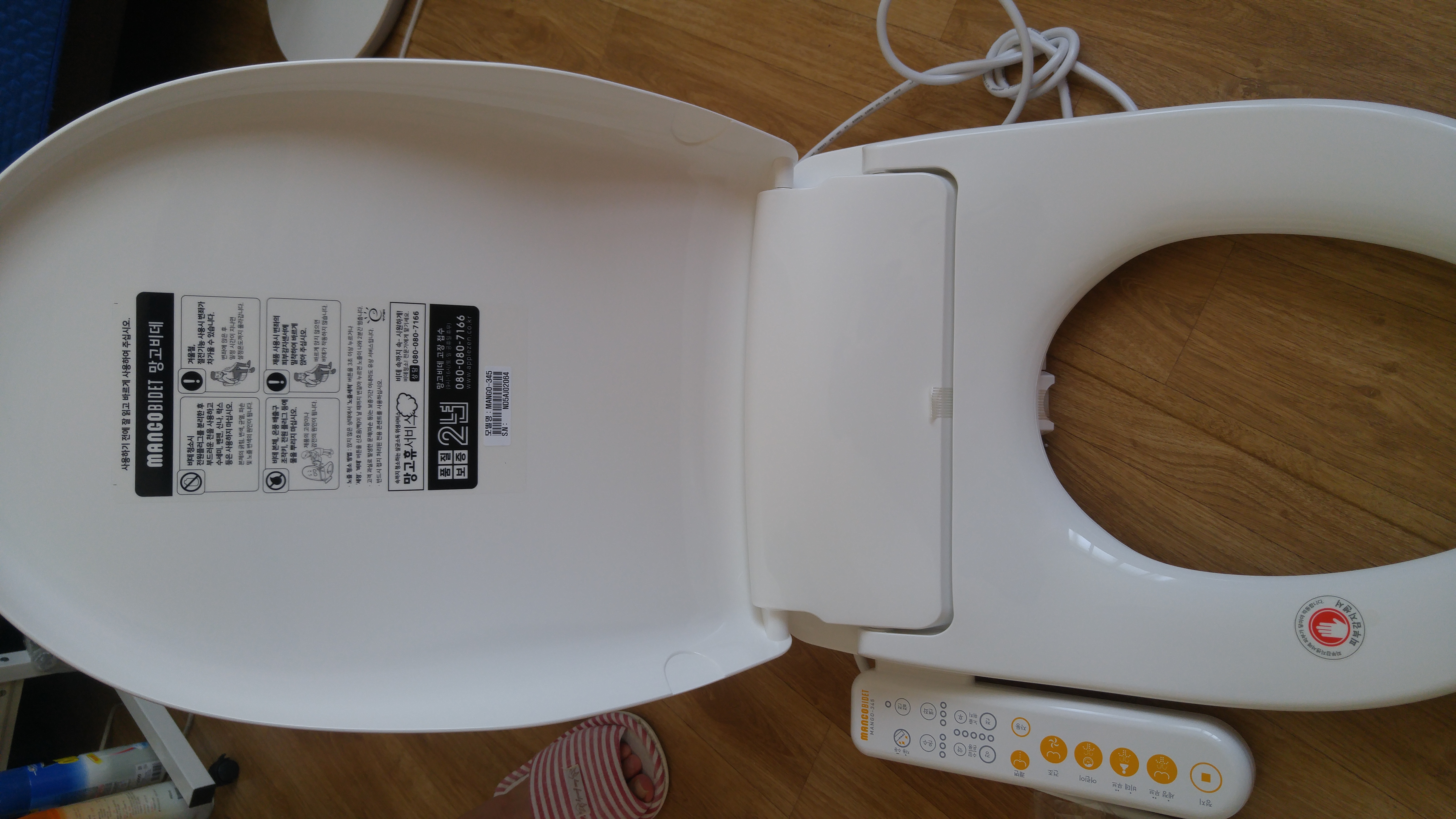 3. 딱 맞출려면 까다로운데 정 가운데를 기준으로 수평으로 맞춰서 쑥 밀어주면 아주 잘 들어간다. 딱 끼워보니 알겠더라. 비데 기기가 설치한 변기보다 훨씬 크다는 것을. 아래 사진 보면 알겠지만, 동그란 부분이 딱 맞는게 아니라 앞으로 좀 튀어나와 있는 걸 볼 수 있을 것이다. 저게 뒤로 바짝 밀착시켜도 저 정도가 한계였다. 구매 전에 정확한 사이즈를 확인해보는 건 필요해 보인다.