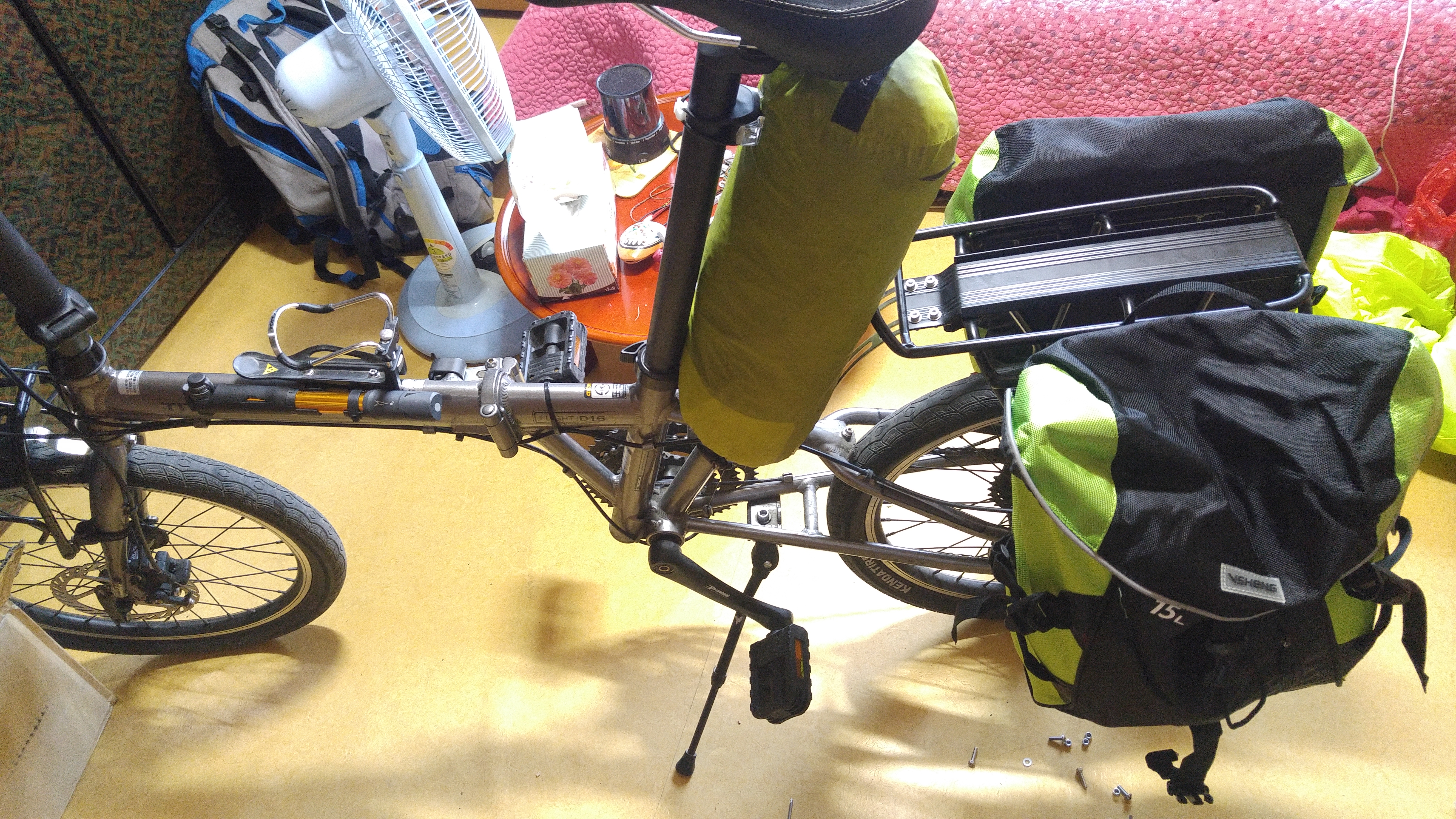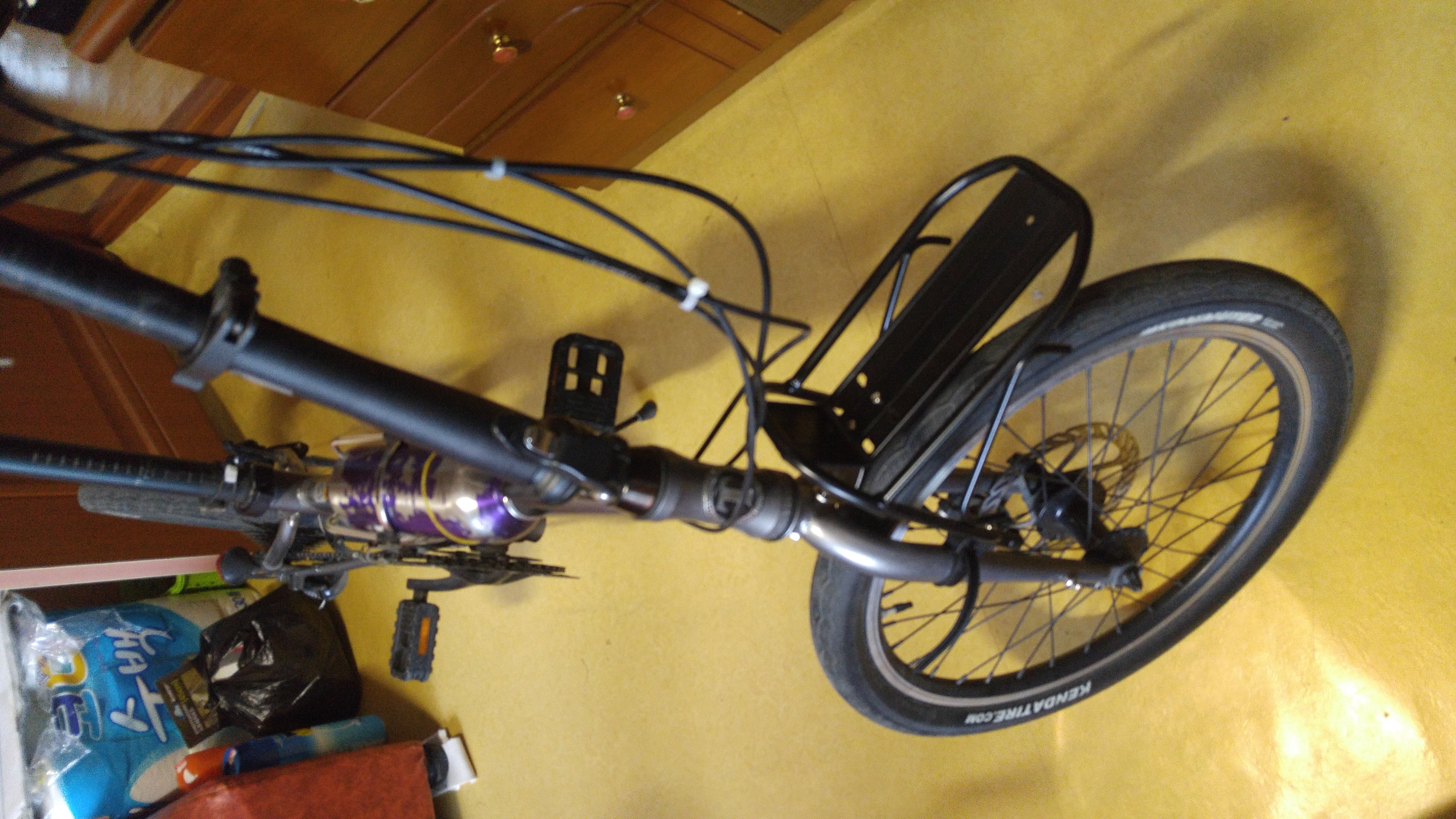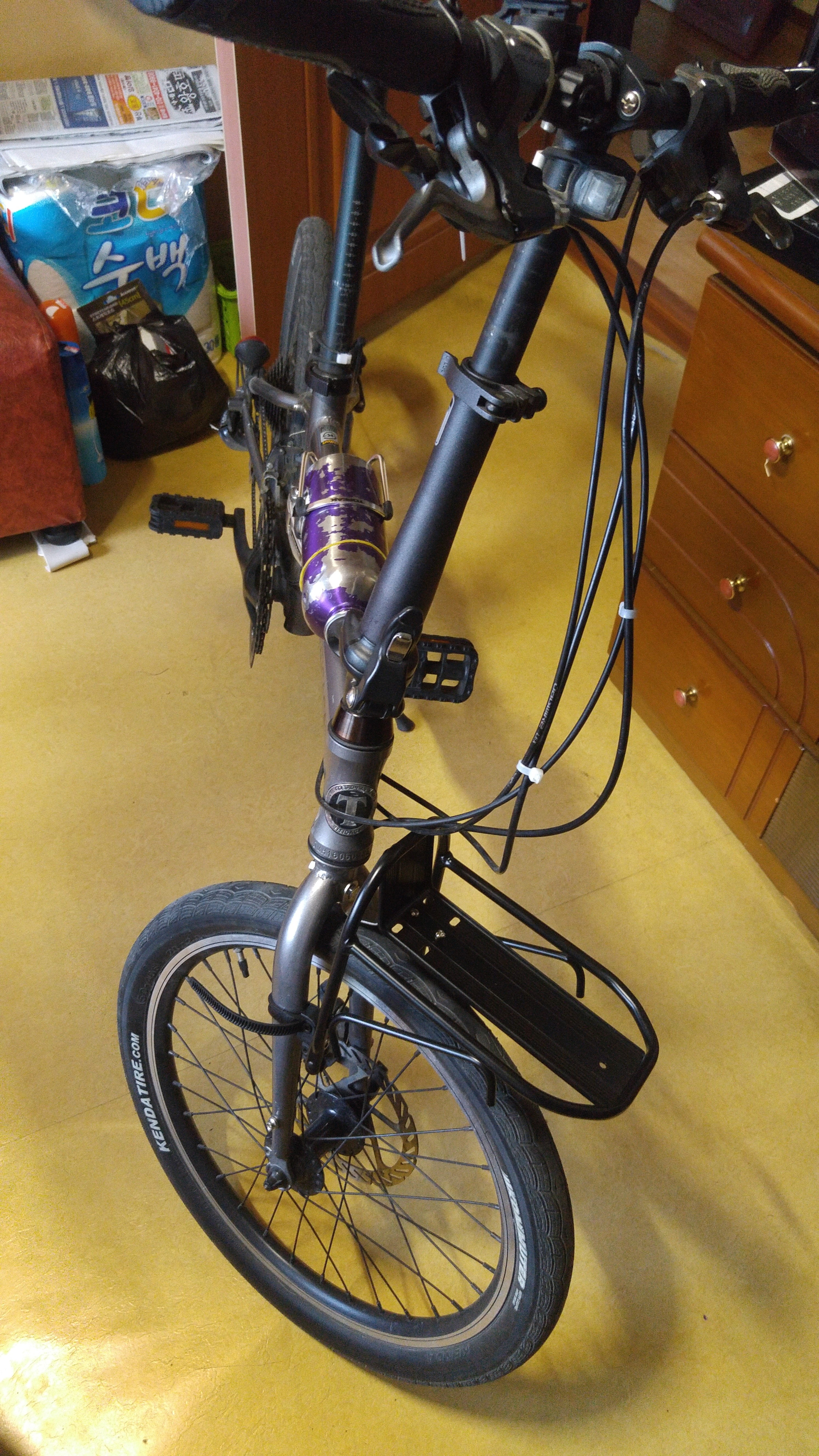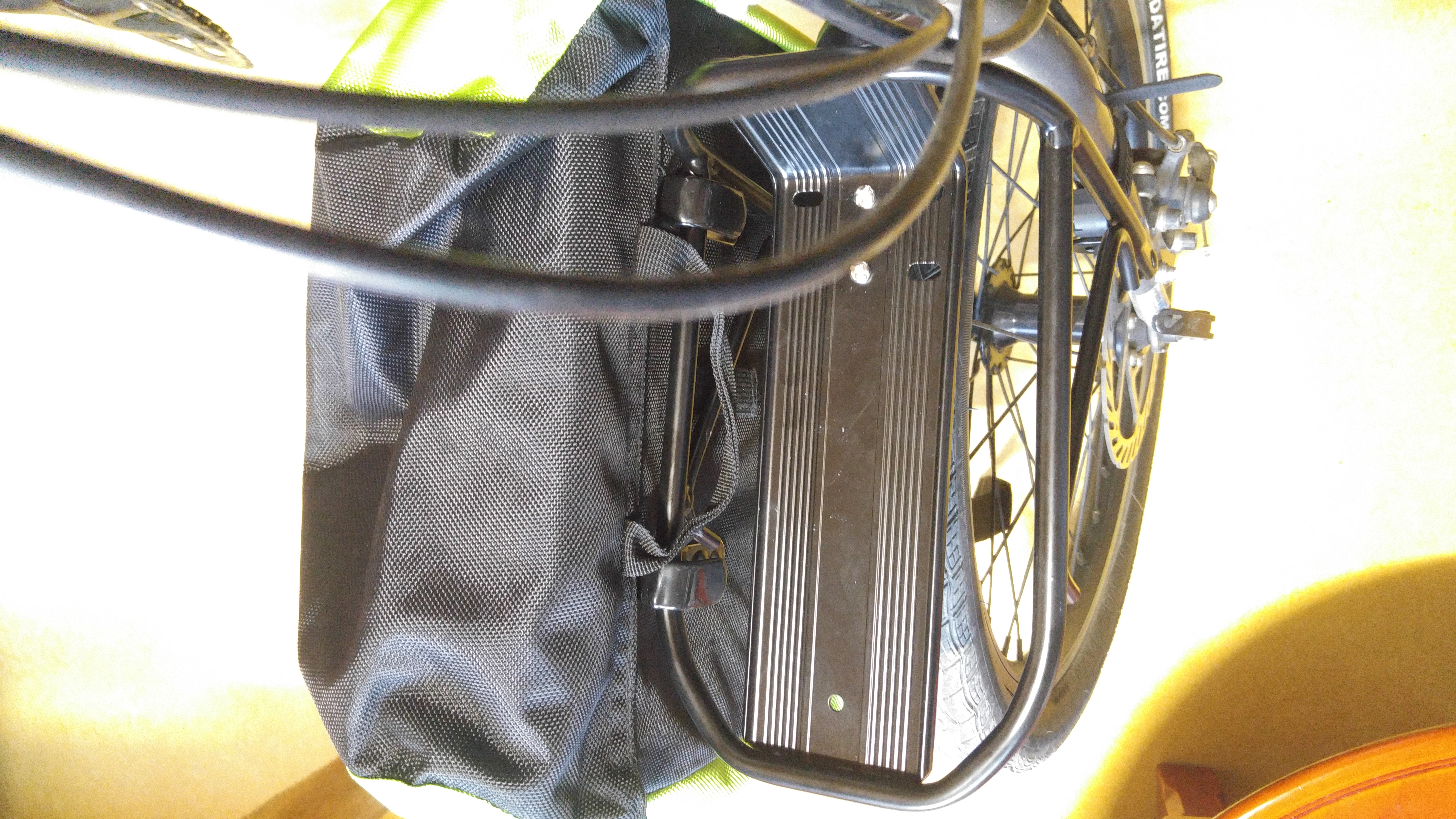 뒤 짐받이와 가방을 설치한 모습. 타이어 사이즈를 제대로 확인안하고 구입해서 앞 부분이 아래쪽으로 약간 기울어져있었으나 짐받이 역할에 큰 무리는 없었다.
