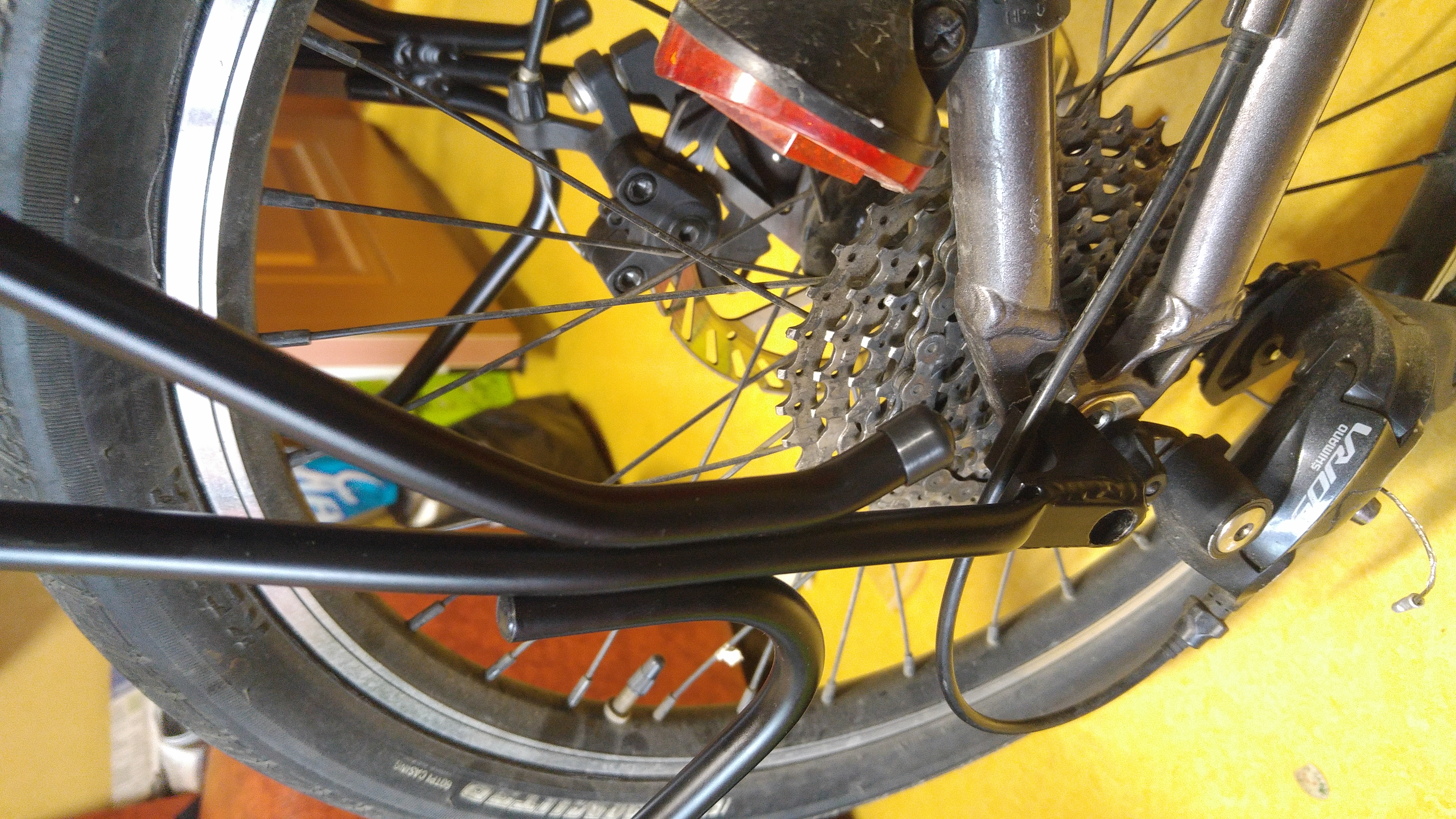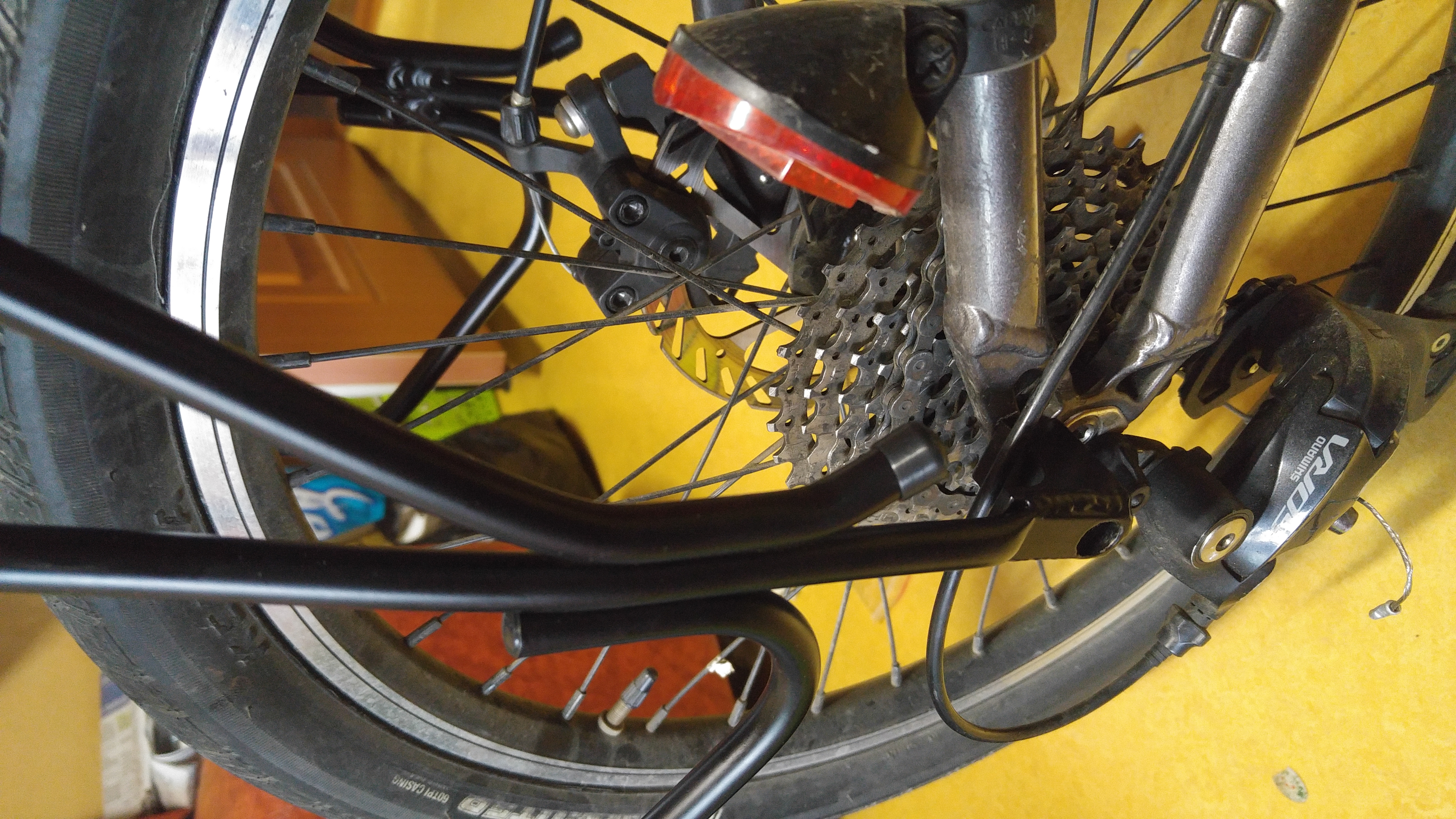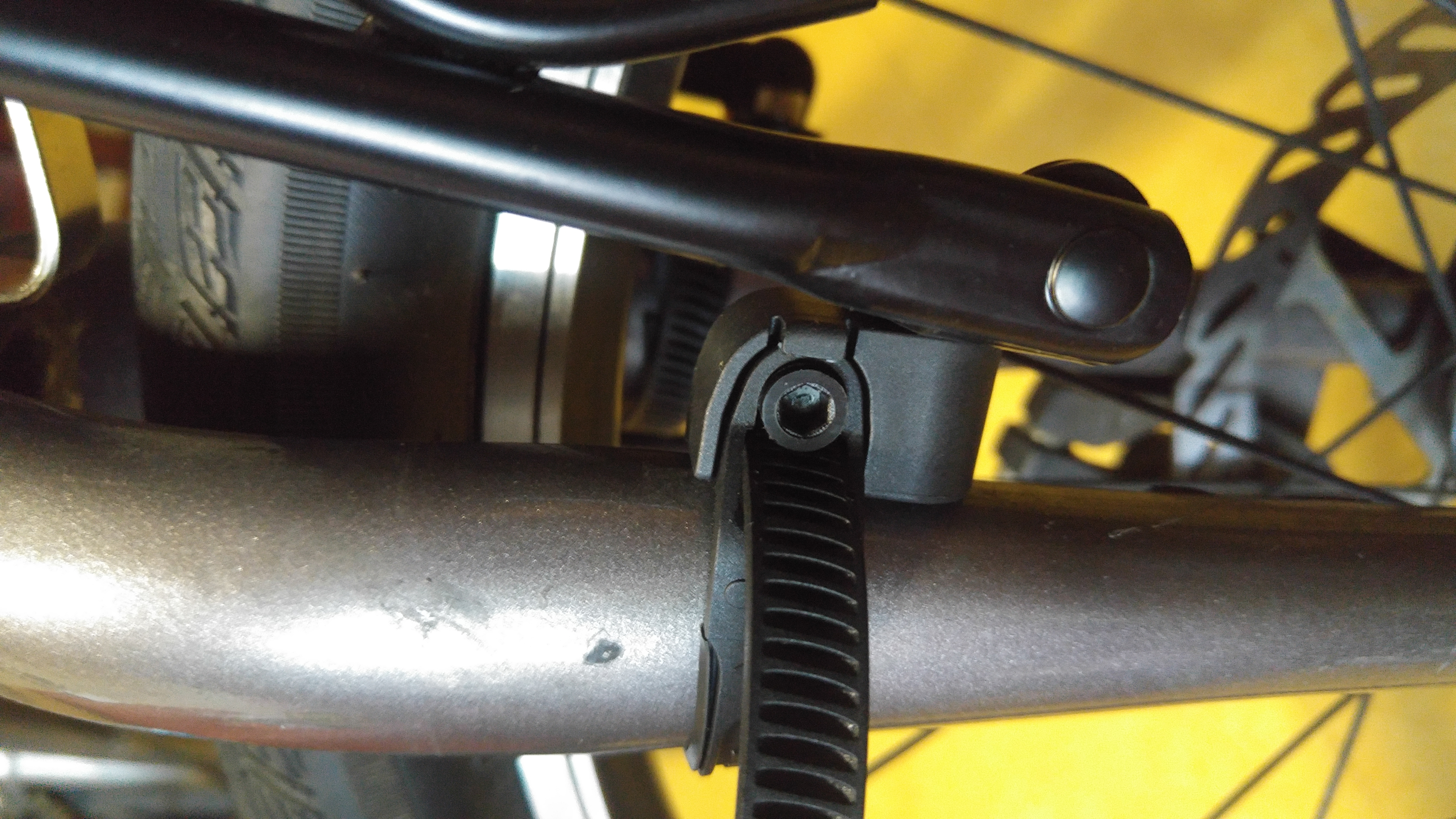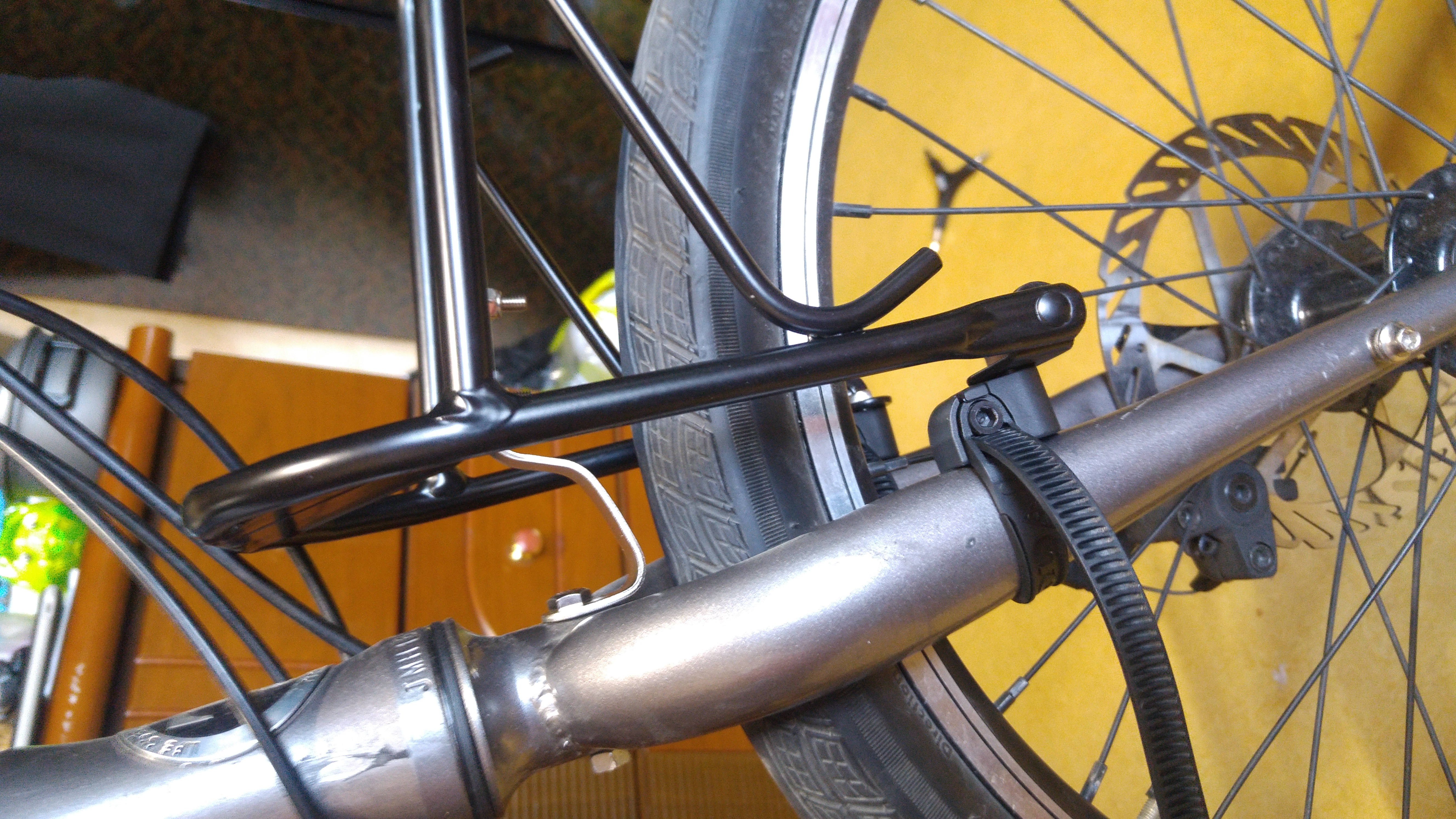 앞 짐받이는 타이를 이용해서 설치함. V 브레이크일 경우 나사를 설치할 수 있으나 디스크 브레이크여서 타이를 이용함. 그리고 11번가에서는 디스크 브레이크용은 없었다.
