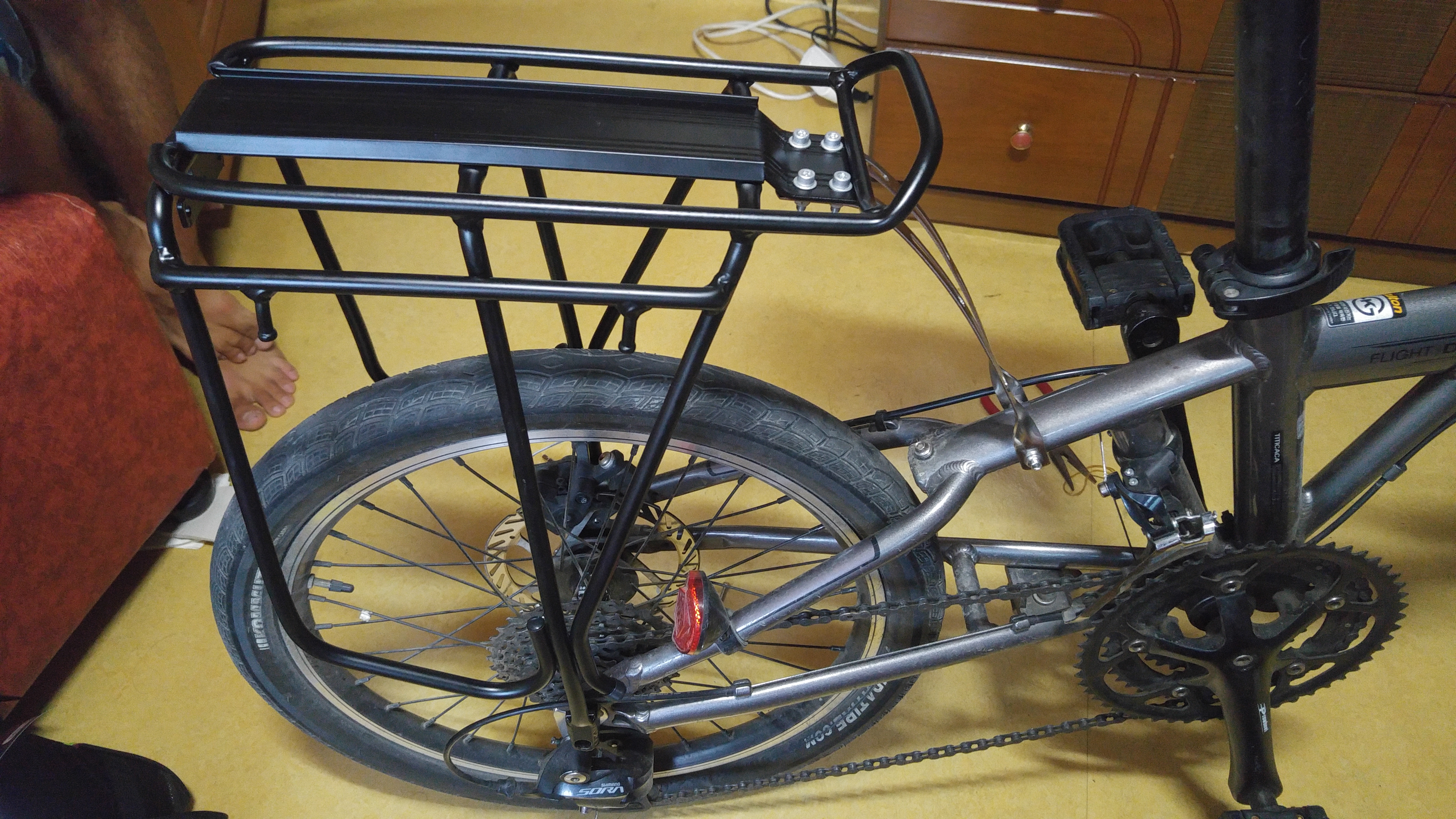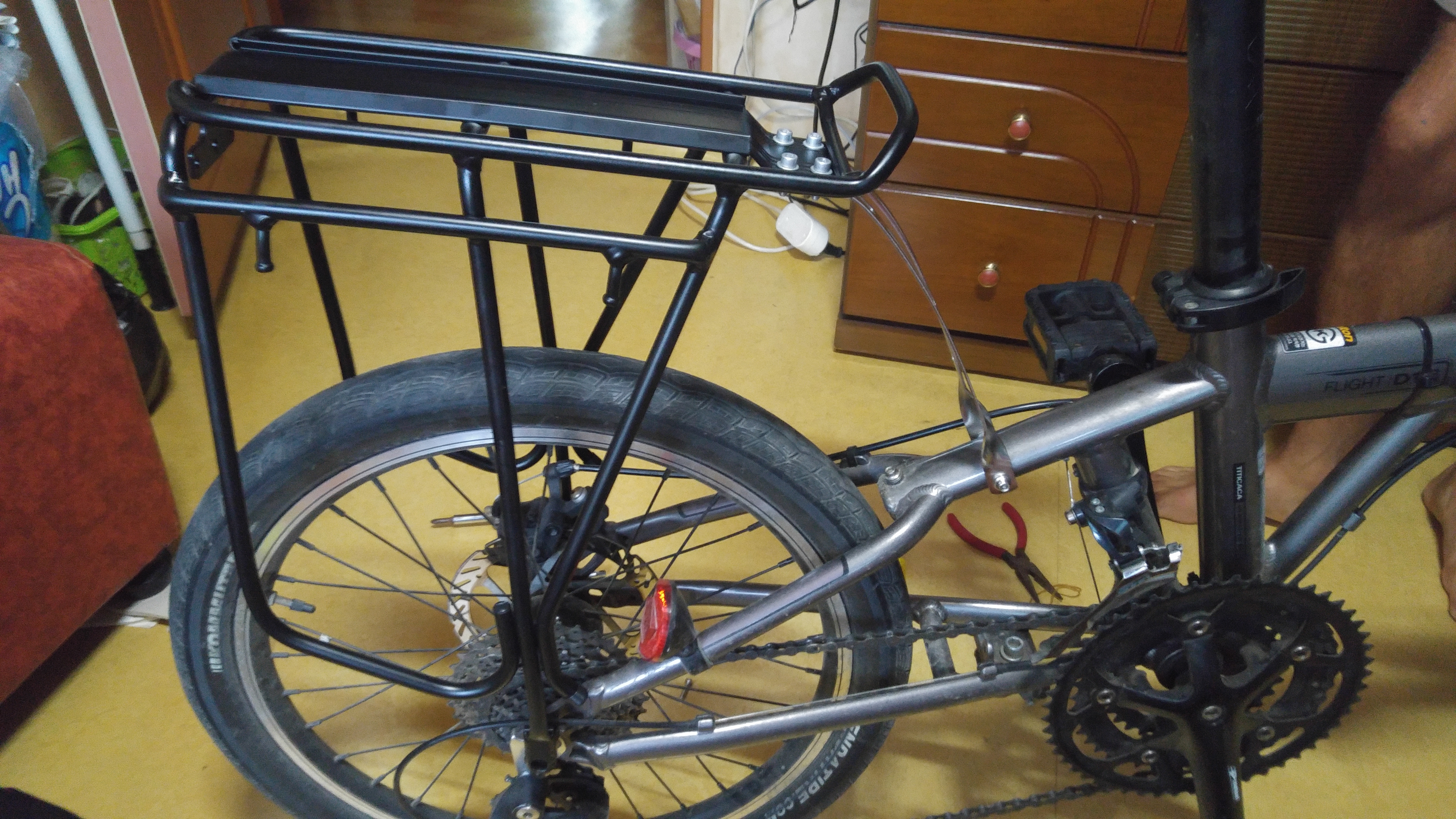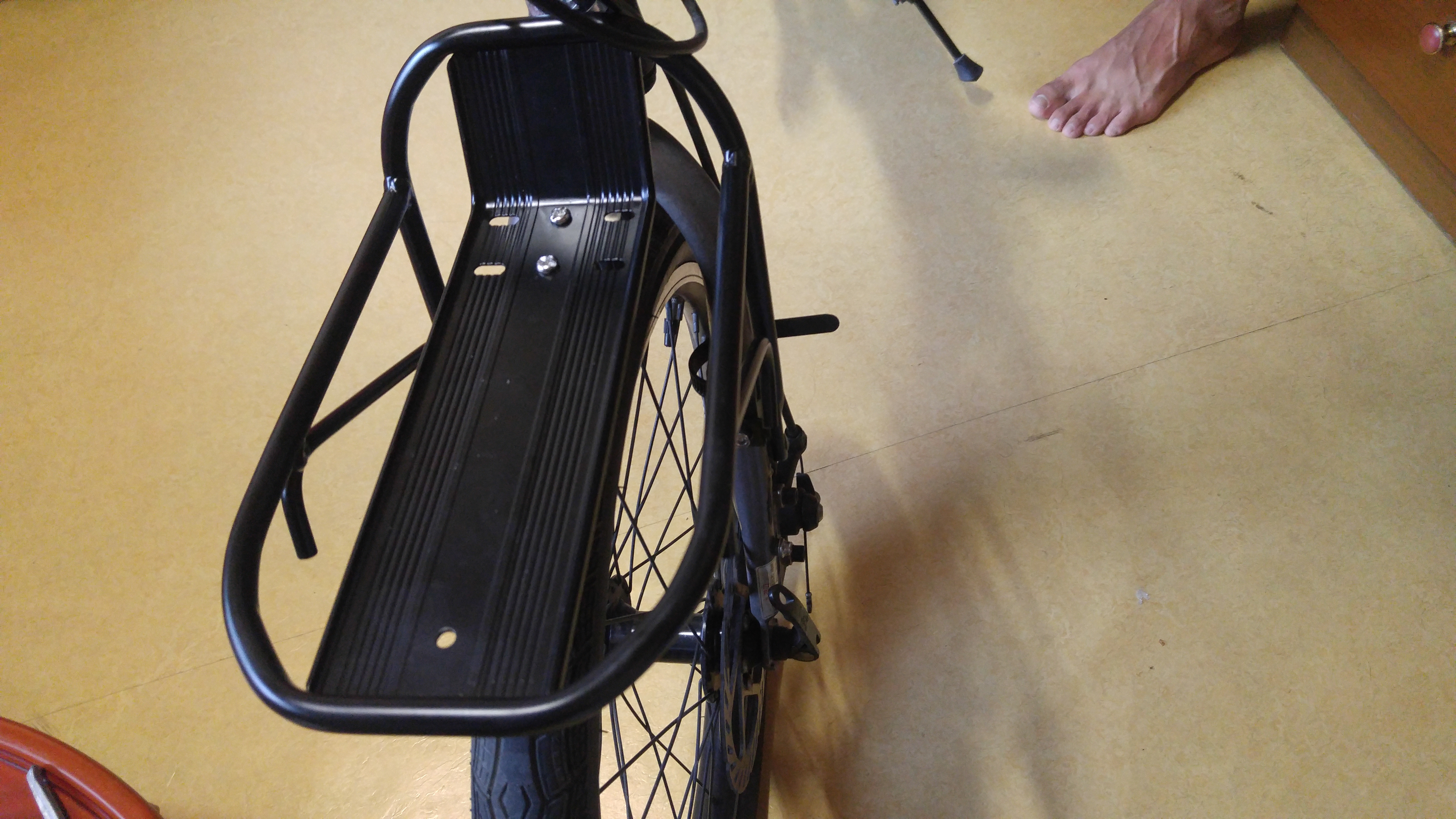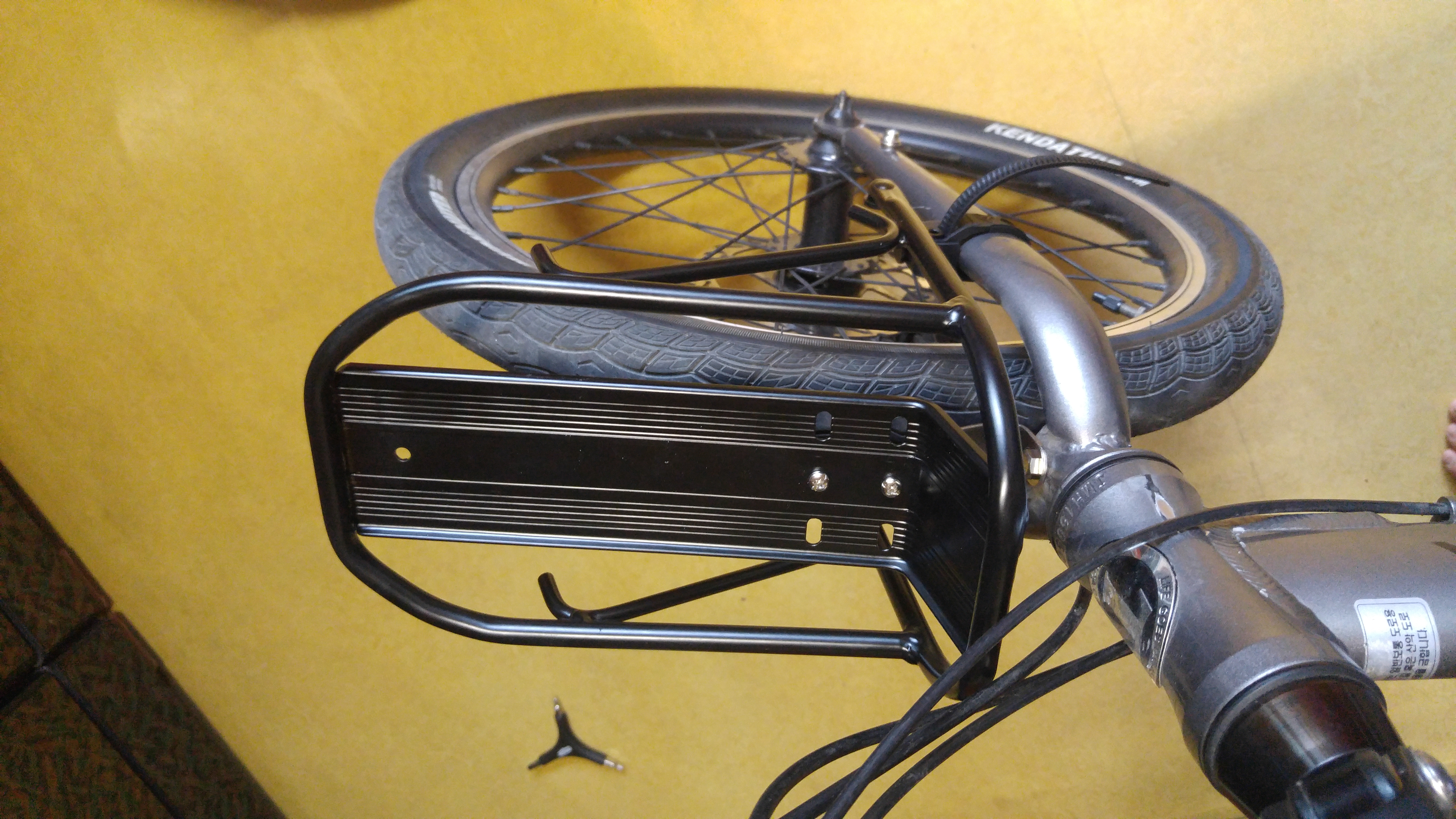 4. 뒷 짐받이는 바퀴 사이즈를 정확하게 알고 구매해야 되는데, 좀 다르더라도 설치하면 된다. 단, 짐받이가 약간 기울어지더라.