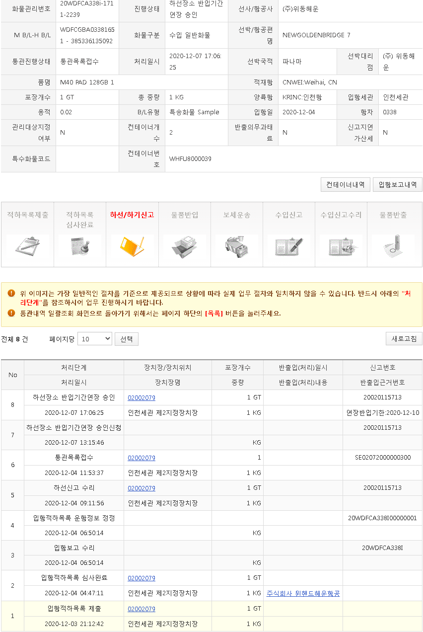 : 이렇게 일방적으로 판매 페이지를 삭제하고 하면 소비자, 구매자로서 불안감을 가지게 마련. 그래서 배송 상태도 보고 알아보고 했는데, 아니 세관에서도 시간이 또 오래 걸릴 줄은 몰랐네. 아래에서 보시다 시피 세관에 12월 3일에 들어왔는데 연장 신청 등으로 12월 7일에도 그렇게 처리되어 있었던 거지. 그래서 더 늦어짐.