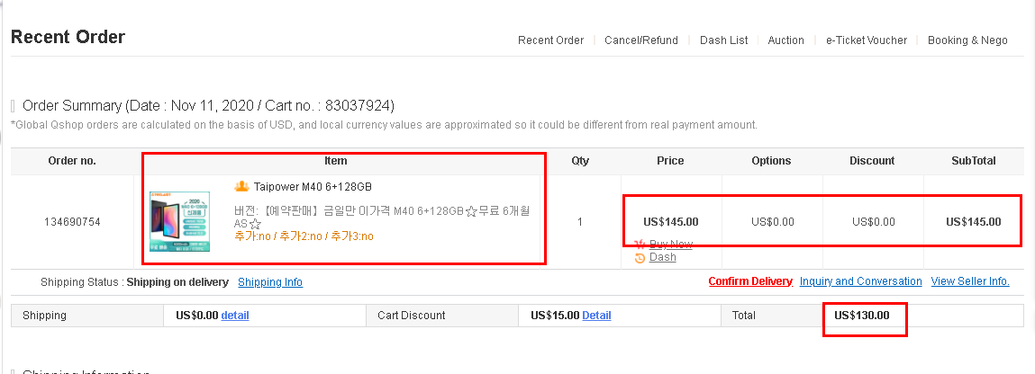 Qoo10 구매한 화면
