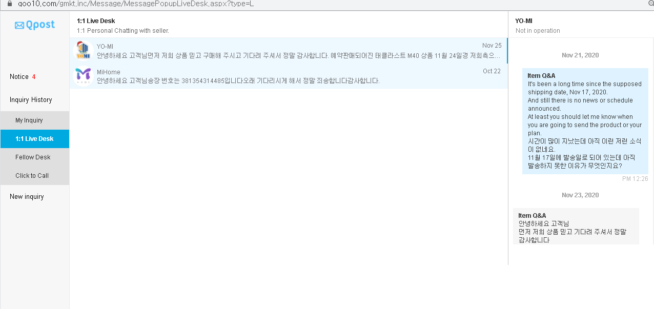 : 11.11 때문인지 Qoo10에 급하게 할인 제품들이 올라왔더라. 아마 이 제품도 물량이 충분히 확보되지 않은 상태에서 판매 물건을 올린 모양이더라고. 그런데 생각보다 주문량이 많았던 모양. 그런데 이 제품이 Qoo10에만 풀린 게 아니고 알리같은 쇼핑몰에도 풀렸기 때문에, 의외로 주문 폭주해서 물량이 없었던 모양이더라고. 주문 후에 연락이나 변화 같은 게 없어서 문의 글을 올리고 했는데, 물량이 없다는 메시지를 보내더라고. 일단 응답이 있으니 다행이라고 생각.