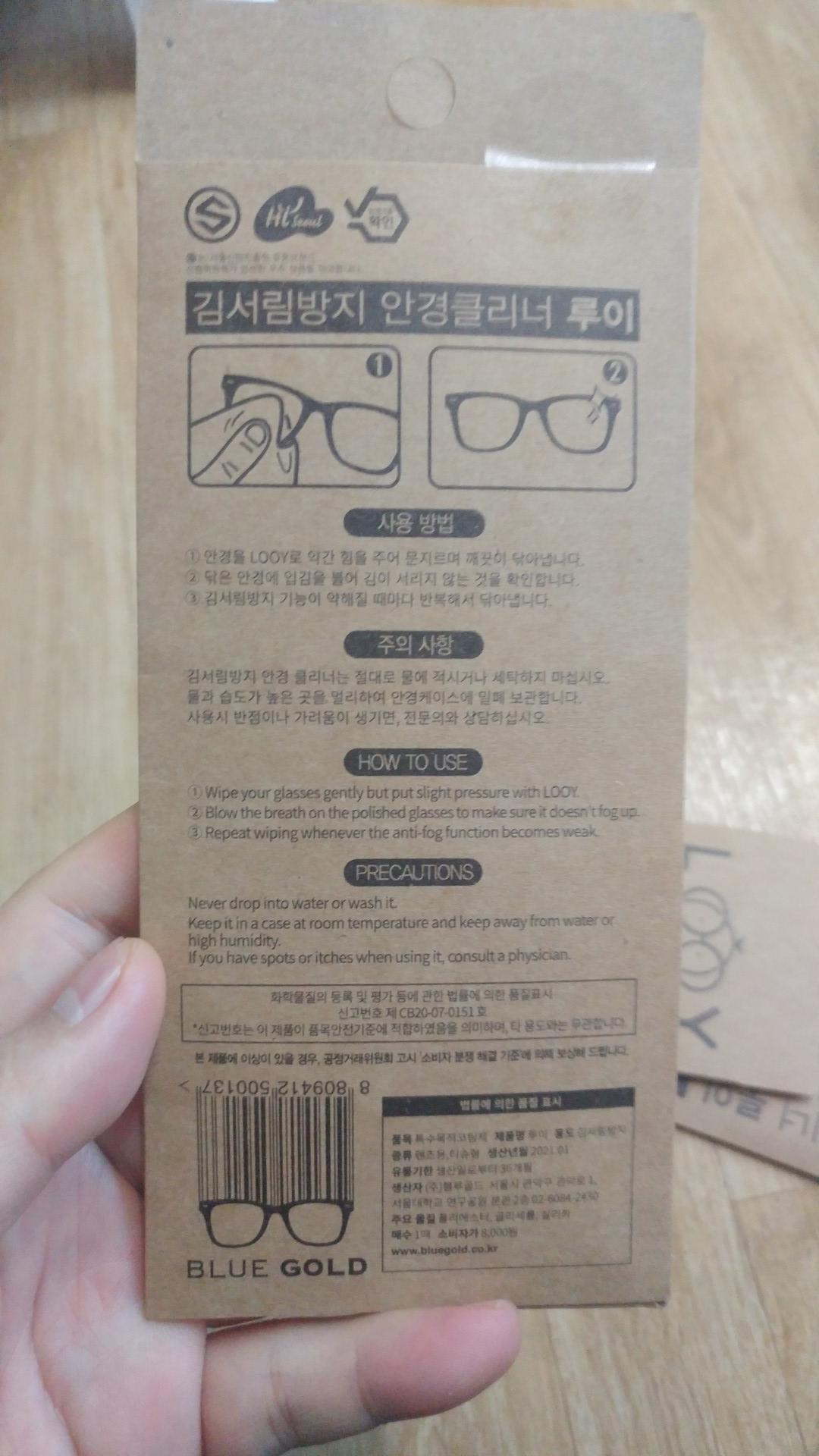 : 총 3개인데 두개만 들고 찍었다. 이걸 선택하기 전에 김서림 방지 방법에 대해서 검색을 좀 해봤었는데 닦아서 막을 만드는 이게 제일 편리해보여서 샀던 거다. 그런데 주의 사항을 보니, 세탁하면 효과가 사라지네. 안경 닦이용이 아니라 안경에 김서림 방지 막을 입히는 용도라는 거!!! 이거 김서림 방지용으로 사용하다가 안경 닦이용으로 사용하면 되긴하겠더라.