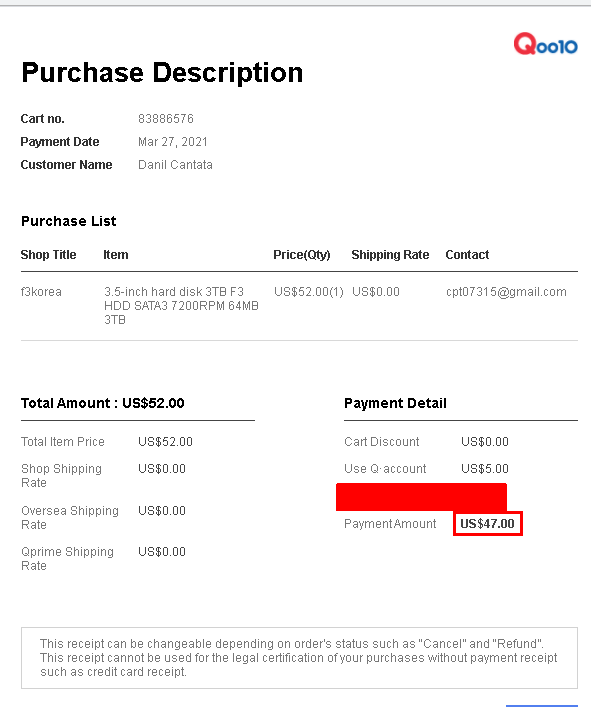 가격: 47 USD(가격 52 USD, 5 USD 할인), 3월27일 주문, 3월 30일 도착(3일 소요, 뭐지? 국내 배송인가?)
