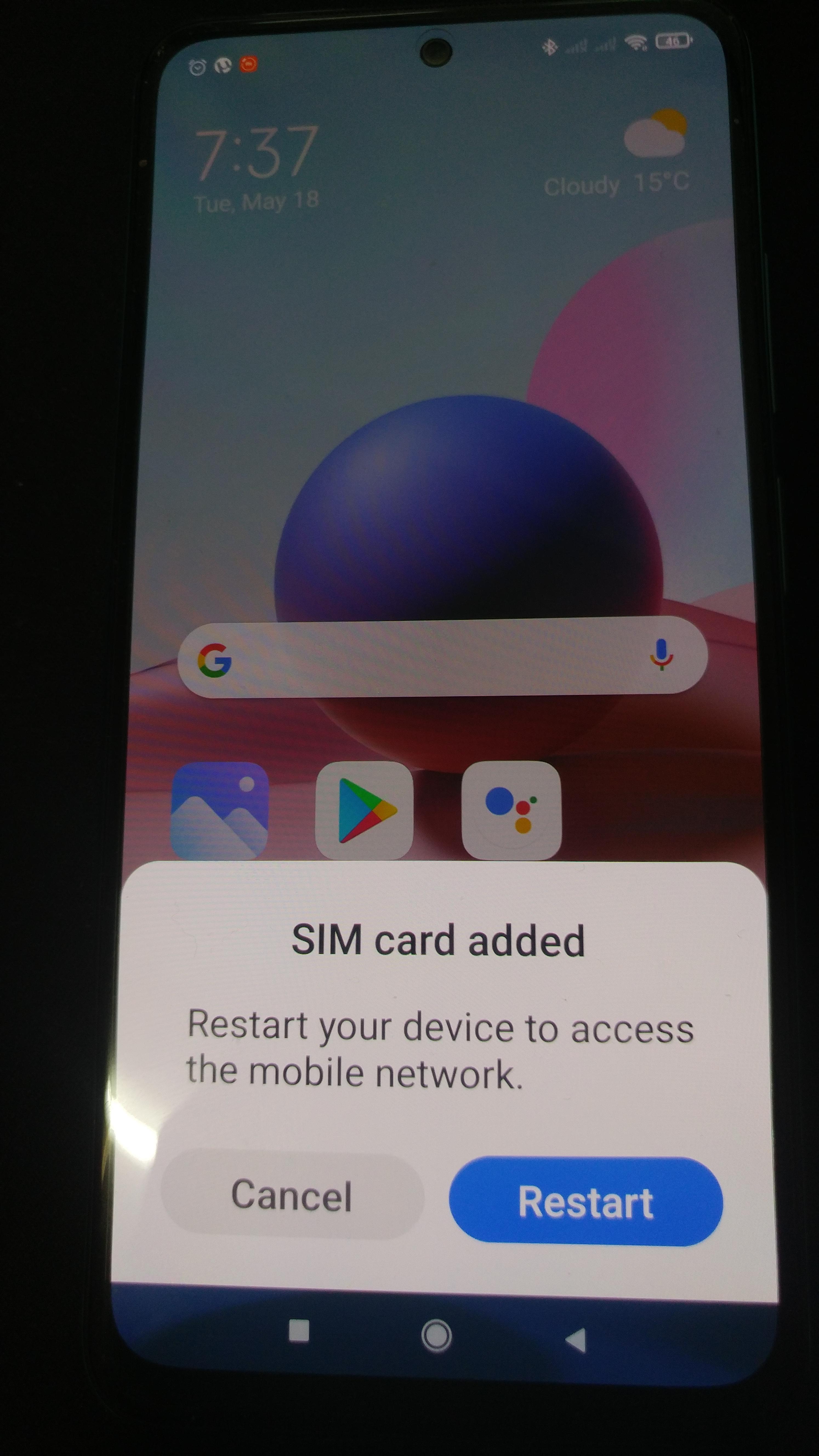 아래처럼 유심 끼우니까, 유심 인식 팝업이 뜨고, 재시작하라는 버튼이 보이더라고..