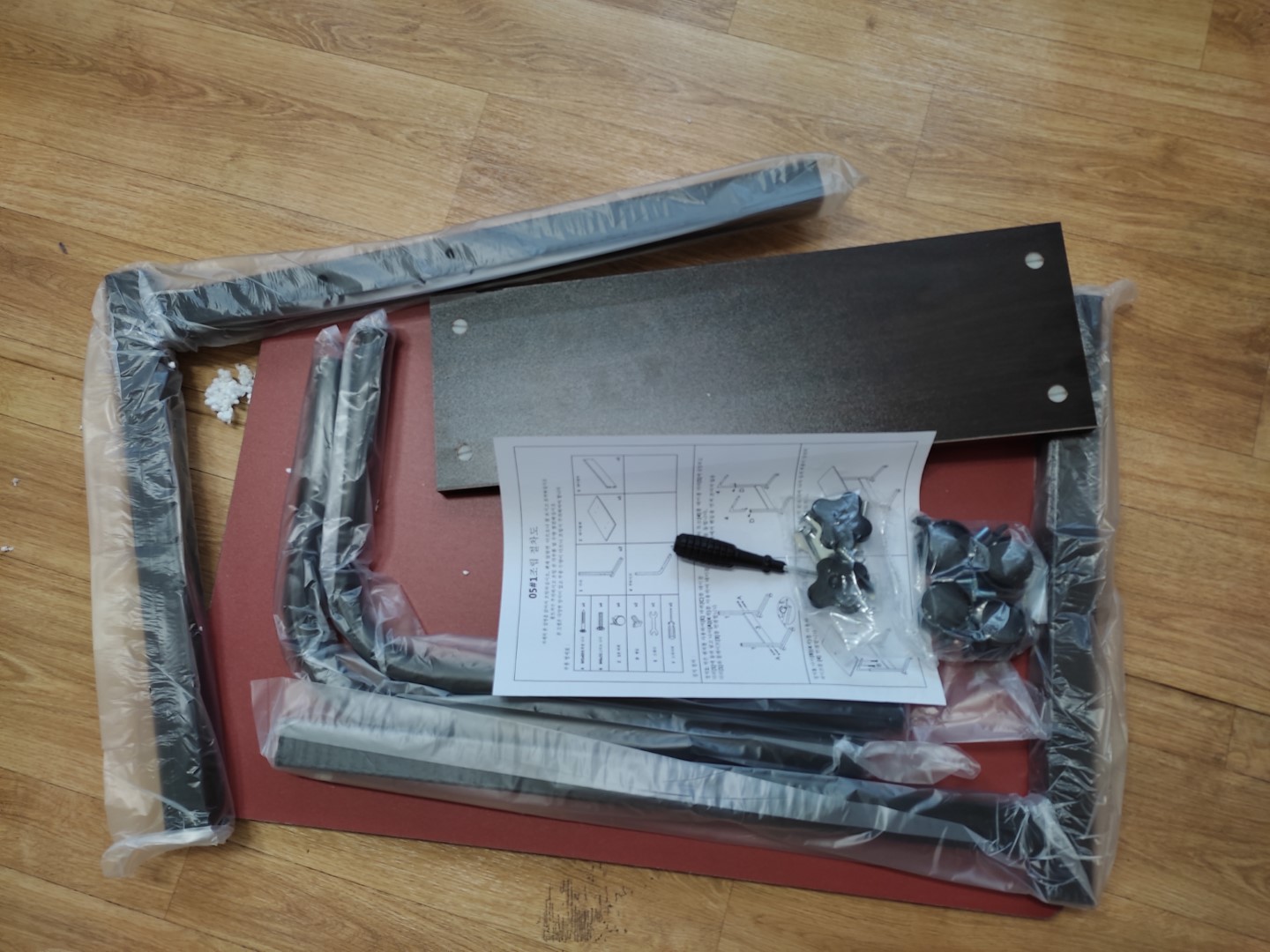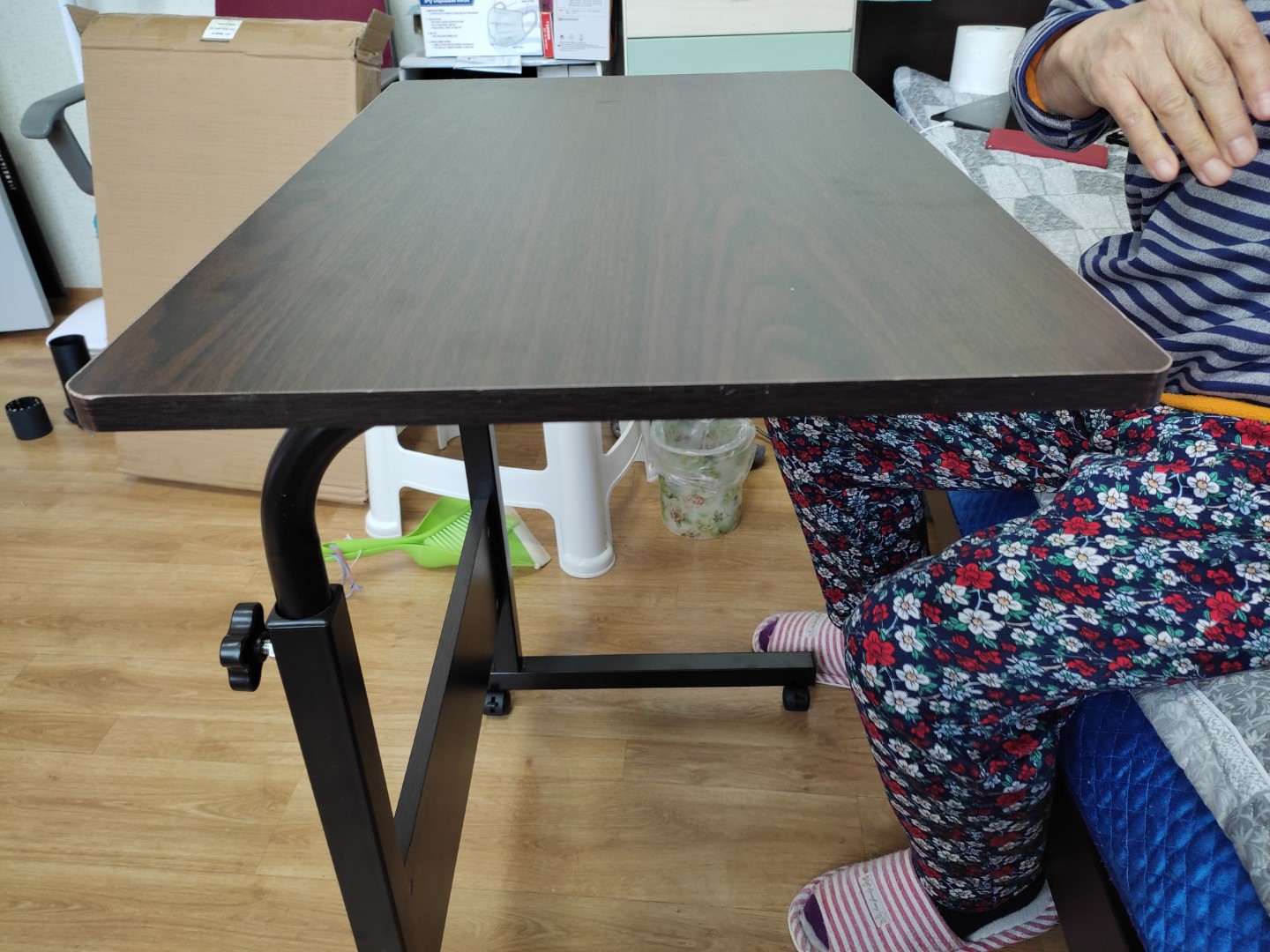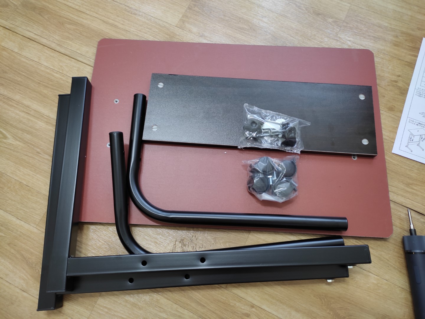 아래 요 바닥은 위쪽 나무 상판인데, 마치 연결된 것처럼 보이는 건 아직 저 바닥부분에 바퀴를 안단상태로 나무 판 위에 놓아서다. 착각하지 말더라고.