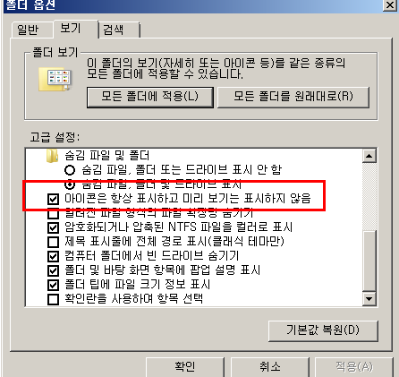 나오는 창에서 "보기"를 누르고 아래 쪽으로 스크롤을 하면 아래처럼 "아이콘은 항상 표시하고 미리보기는 표시하지 않음"이라는 선택 메뉴가 보일 것이다. 저것을 선택해제해주면 된다.