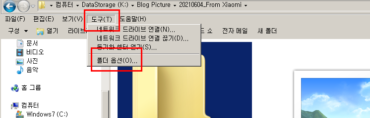 아래처럼 메뉴 중 "도구"를 누르고, 그 다음 "폴더 옵션"을 누르자