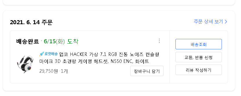 가격: 총 29,750원, 6월 14일 주문, 6월 15일 도착. 총 1일 소요.