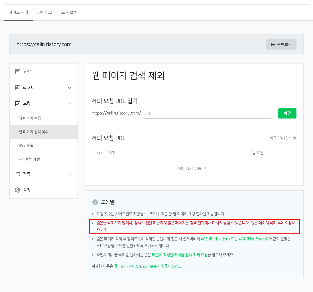 그리고, 사이트 내 페이지나 하위 사이트를 제거하는 방법이 있는데, 그걸 설명한 건 아래 링크인데, 공홈에도 자세히 설명되어 있다. 기본적으로 searchadvisor.naver.com으로 들어가서 사이트 등록도하고 해야 한다.