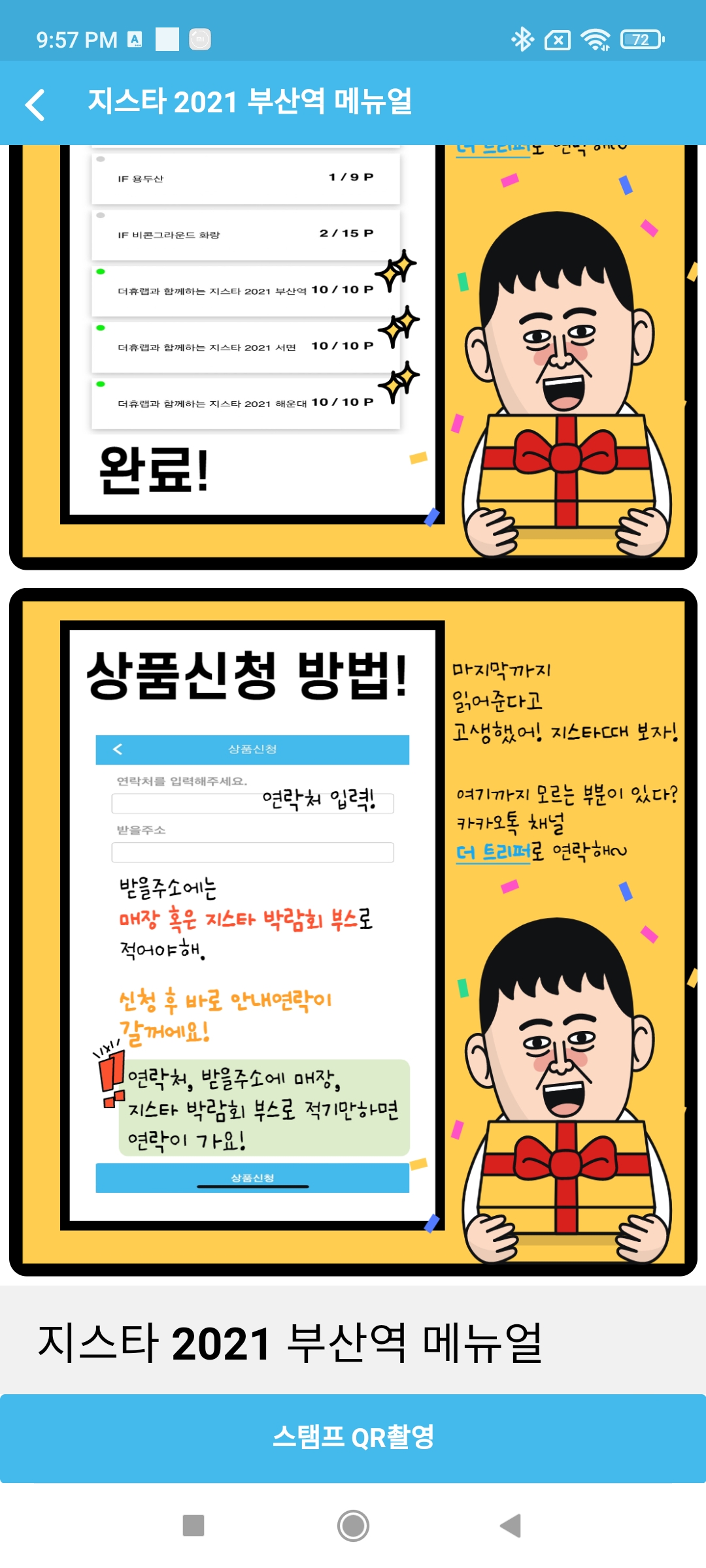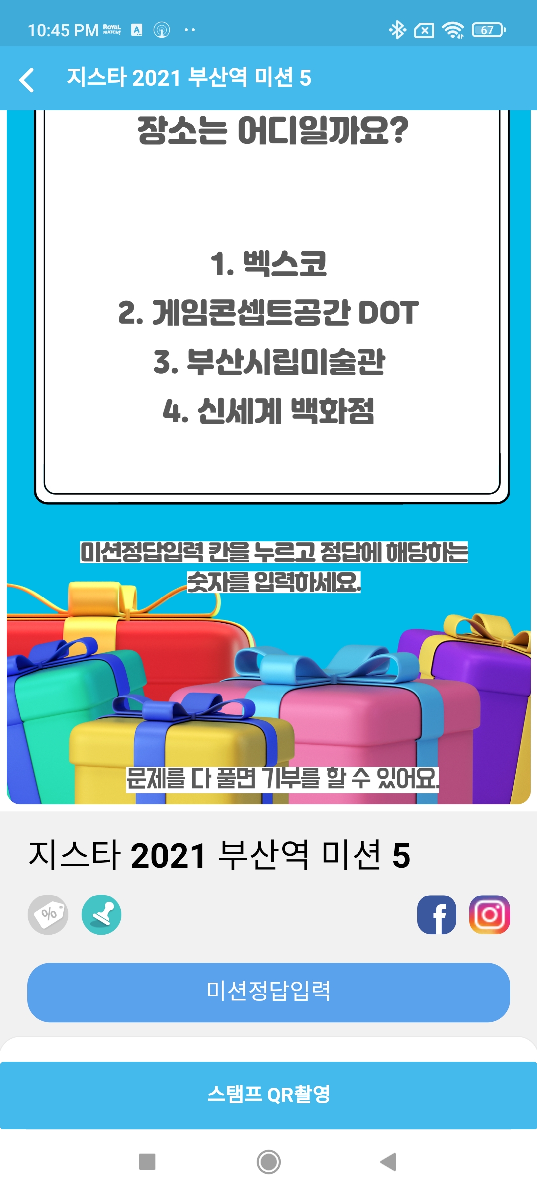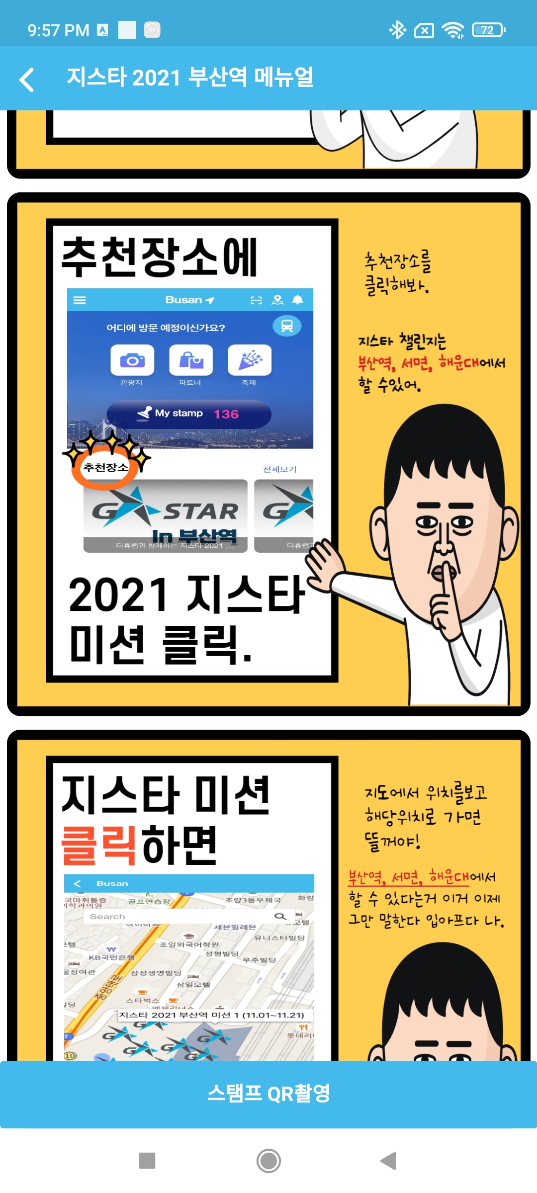 3. 위 해당 기간에(21일까지이긴 하지만, 굿즈가 빨리 없어질 것이라 예상하므로 최대한 빨리) 이벤트 장소인 "부산역", "서면" "해운대(벡스코 포함, 해운대에서 거리가 있음)"로 간 다음 어플을 실행하고 지스타 로고와 간 위치에 해당하는 사진을 선택한다.